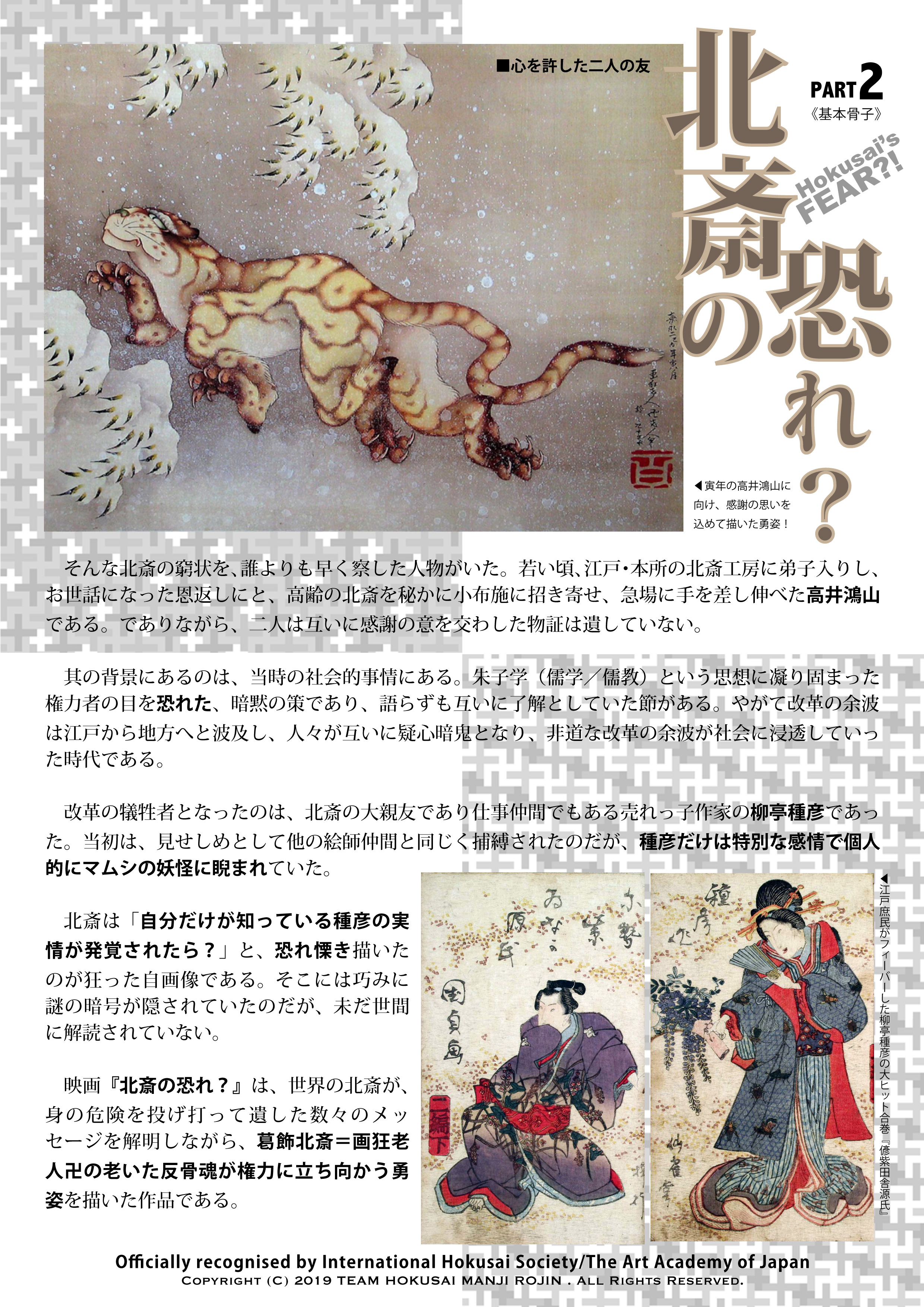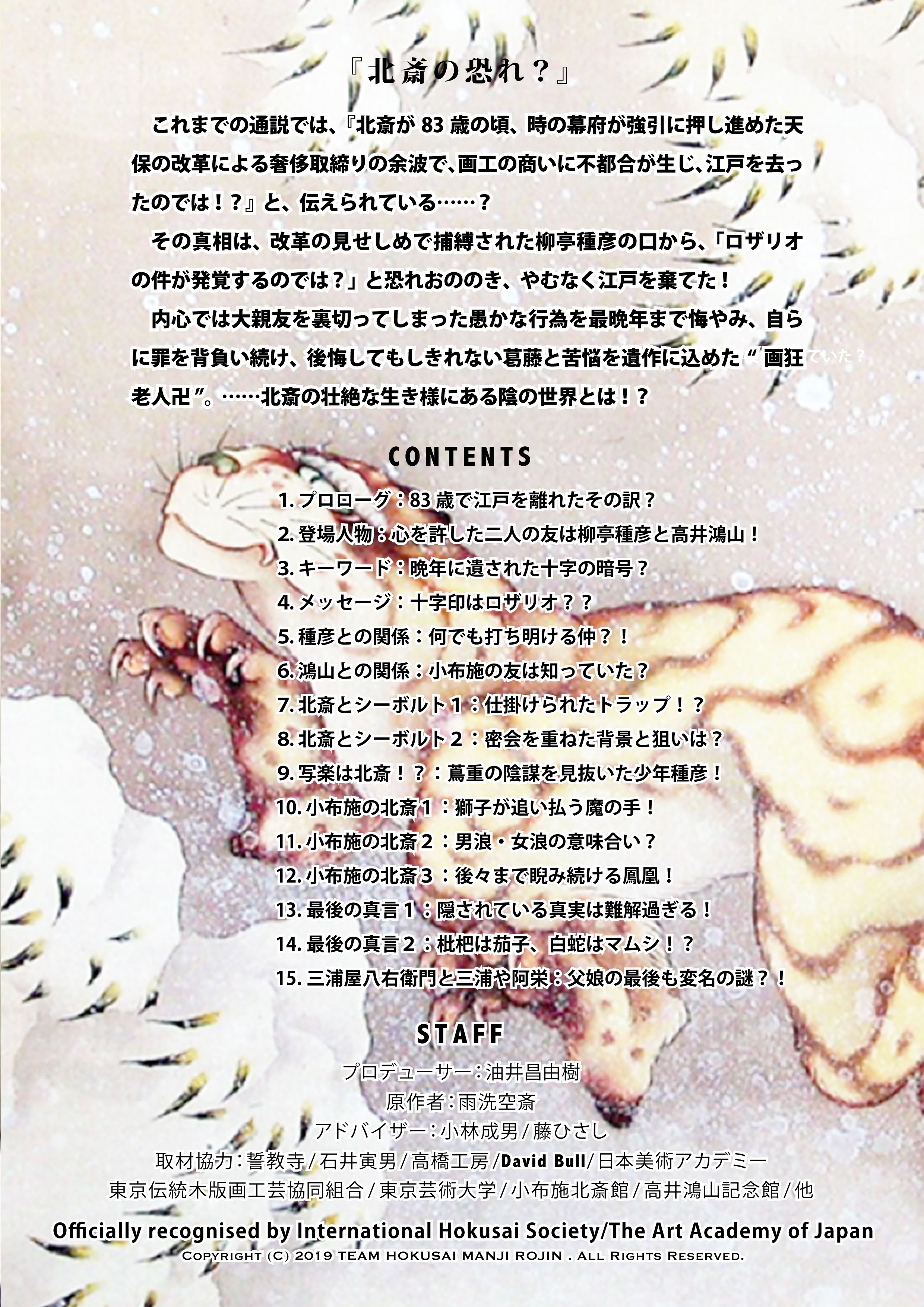 ・深淵な洒落づくしで描かれた隠し絵を駆使して、北斎ならではの信念に裏づけされた生き様、さらには師弟愛よりも堅い絆で結ばれた、無二の友との繋がりだけが、事の真相を語っているのかもしれない。