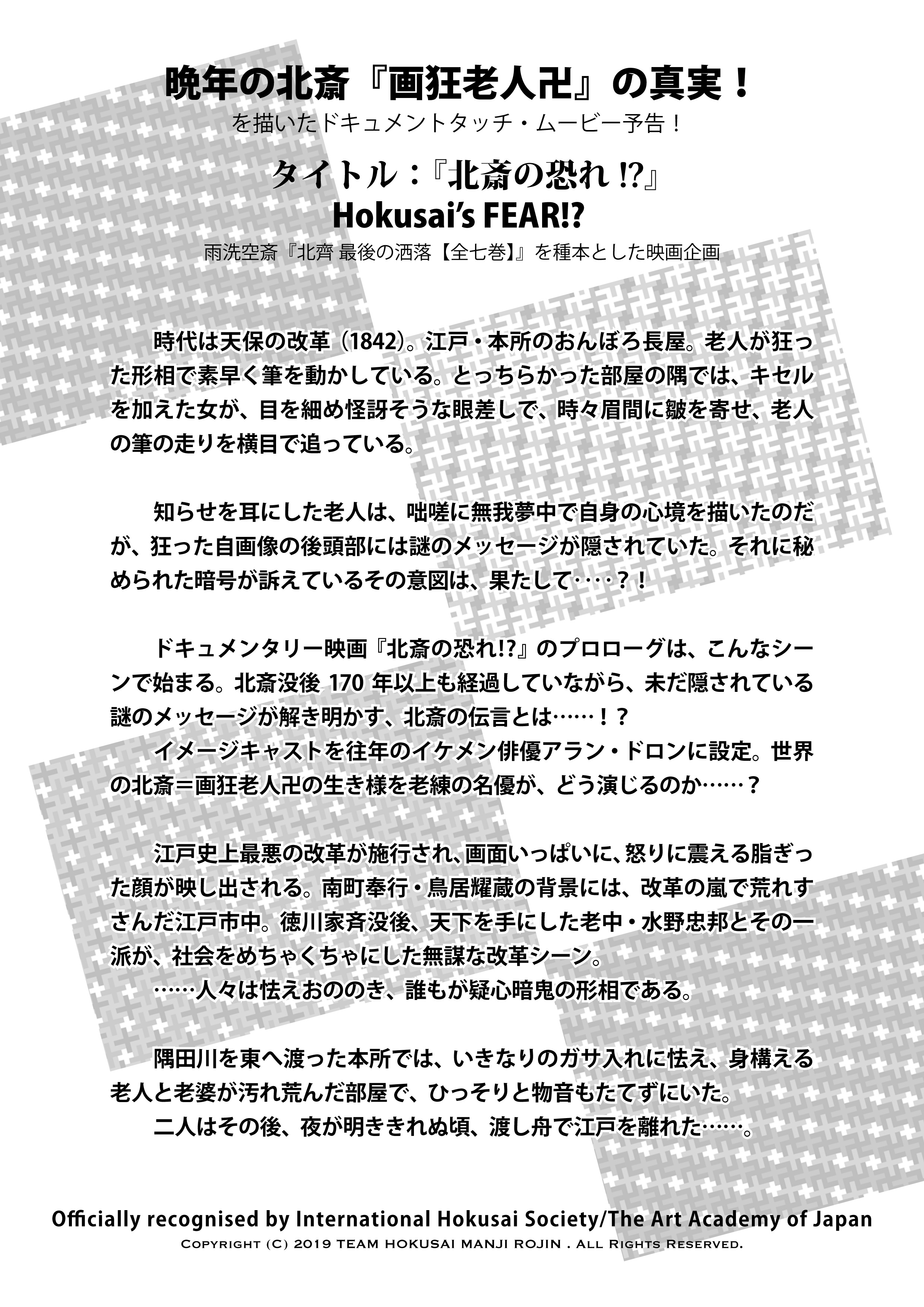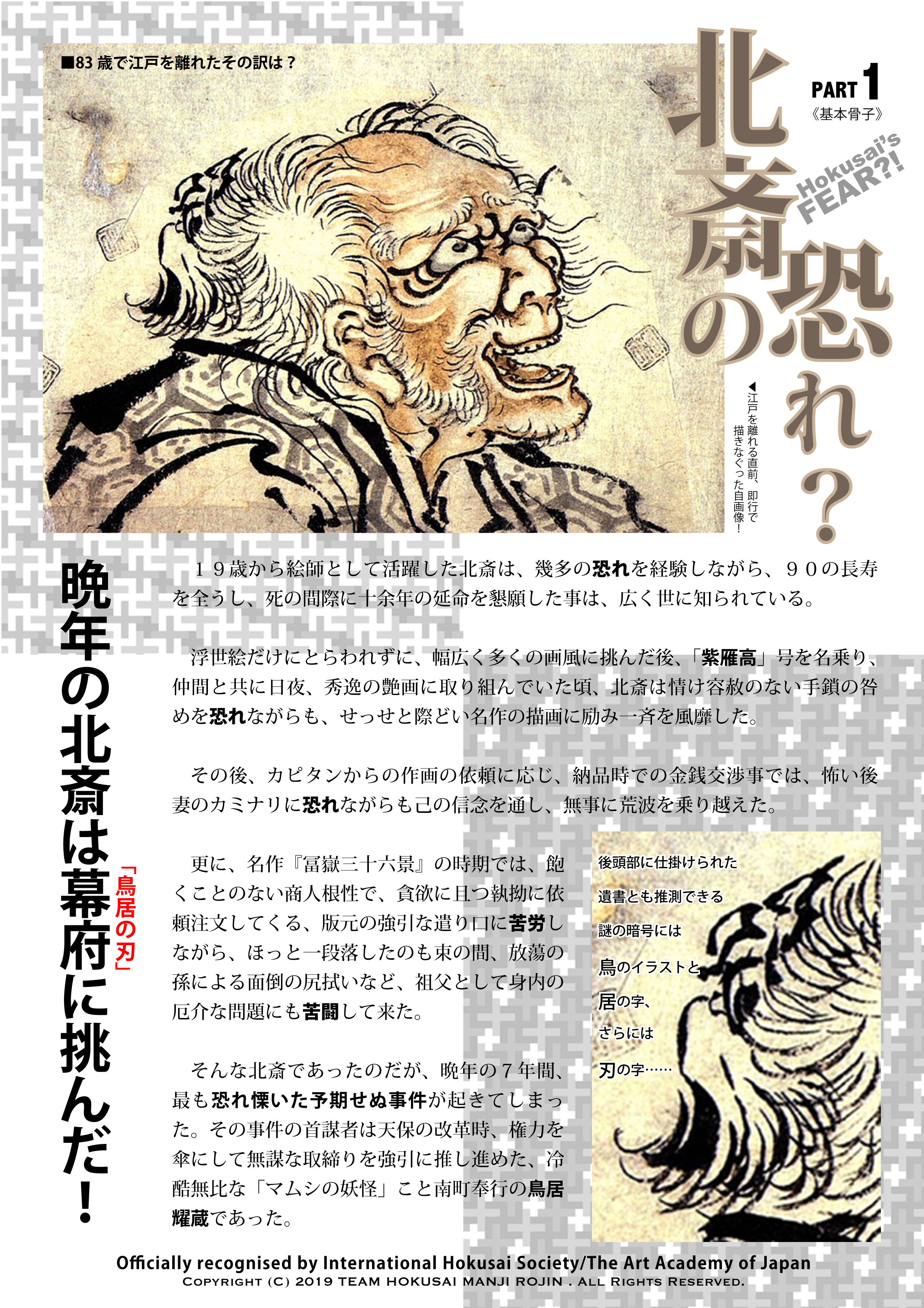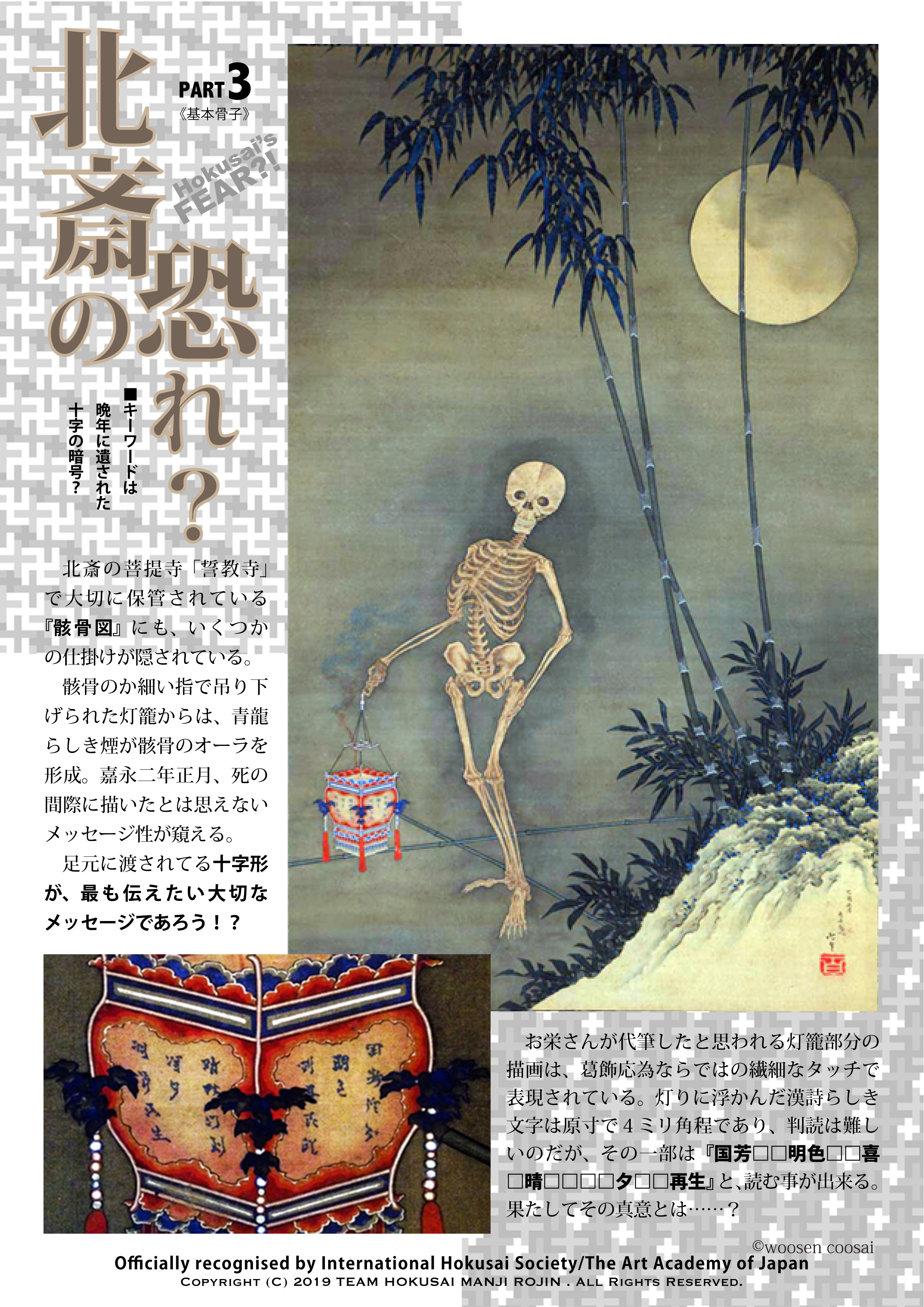 ・当時では比類無きスーパー高齢者であった北斎は、とある事件が切っ掛けとなり70代で開花し、死の間際に「あと十年の命があれば本物の絵が描ける!……」と願いながらも叶わず、この世を去った。……その後、当時はもちろん現代まで、さらには未来まで、その偉大な遺産は世界を唸らせる筈である。しかしながらその遺作は時代の変遷と共に、ますます脚光を浴びているが、最晩年の正月に描いたとされる、最期の肉筆画絹本「骸骨図」に秘められている「卍老人最期のメッセージ」は、意外と知られていない?……。